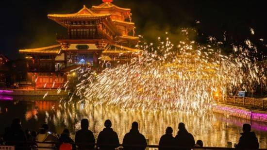 2026年1月1日,游客在山东德州乐陵影视城景区内观看打铁花演出。